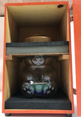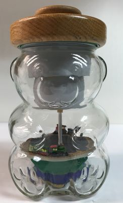 Two displays were considered but some experimentation and time constraints (yes, we had months of notice, but you know .) helped settle on a simple but ambitious design: Build an operating model railroad in the space provided by a PBJL. The components to make it operate satisfactorily would not fit under a PBJL sitting on a flat surface, so the mechanism and controls were built under the PBJL, inside the jar, as was the layout. In order to provide sufficient space, it was deemed appropriate to use the whole jar for the layout and controls, thus carrying the peanut butter theme beyond the mere lid. The actual layout has two trains which revolve on a circular "track" no larger in diameter than the PBJL concealed in the wooden lid of the jar. The complex and constricting surface of the interior of the jar used was a challenge itself to get the components into, never mind operating. The actual layout would not fit into the inside of the jar because the thickness and the shape of the jar were much too constricting, so the layout had to be sawed in half and reassembled inside the jar. Power